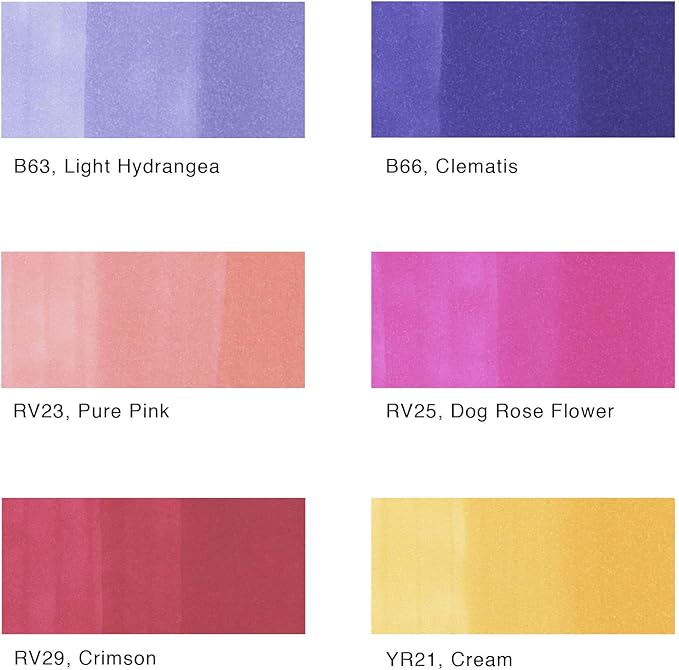 - This 6 piece set includes blue and pink tones with a splash of yellow: RV23, RV25, RV29, B63, B66, and YR21. A great match with the Earth Essentials set for creating vibrant landscapes.