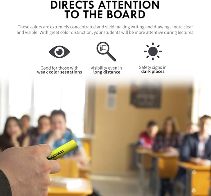 - LUMINOUS CHALK: Clear, vivid and bright luminous colors are effective at highlighting important topics in lectures, writing work instructions at construction sites or adding a pop of color to an art piece. Bright colors grab student's attentions quicker and make them more concentrated on the information at hand. Especially ideal for students with weak color sensations/identification as well as short-sighted students as vivid colors can be seen from a distance
