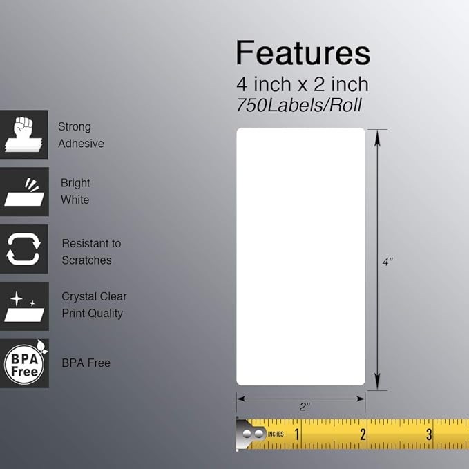 - [ Specifications ]: 4 in x 2 in (102 mm x 51 mm) (750 Labels/Roll, 2 Rolls),Paper tube diameter:1"(25.4mm). No Ink Toner or Ribbons Needed! Save your money and effort.