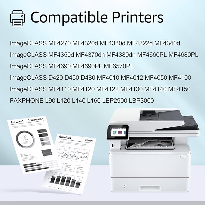 - Compatible for Canon Printer: FAXPHONE L90 / L120 / L140 / L160 / LBP-2900 / LBP-3000, ImageCLASS D420 / D450 / D480 / MF4010 / MF4012 / MF4050, ImageCLASS MF4100 / MF4110 / MF4120 / MF4122 / MF4130 / MF4140 / MF4150 / MF4270 / MF4320d / MF4330d / MF4322d MF4340d / MF4350d / MF4370dn / MF4380dn MF4660PL / MF4680PL / MF4690 / MF4690PL / MF6570PL, LaserJet 1010 / 1012 / 1015 / 1018 / 1020 / 1022 / 1022N / 1022NW / 3015 / 3020 / 3030 / 3050/ 3050Z / 3052 / 3055 /M1319F MFP / M1005F MFP Printers.