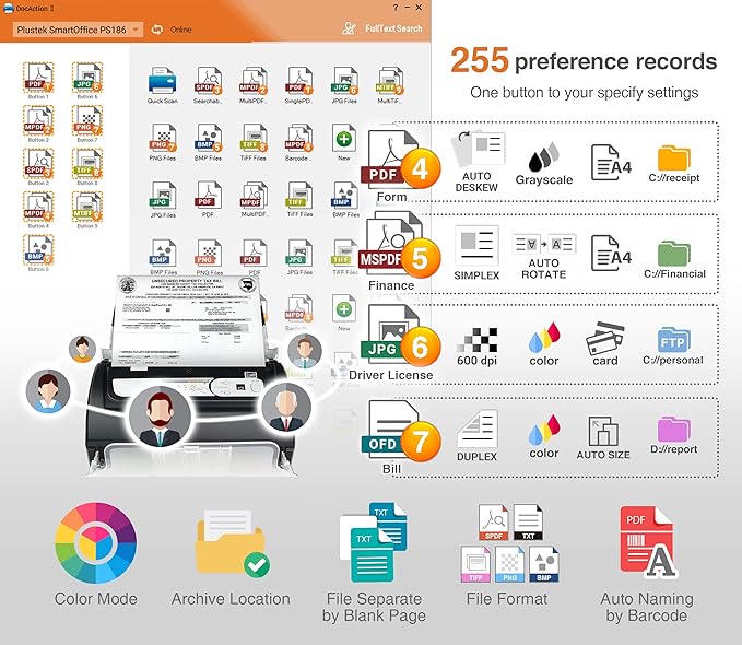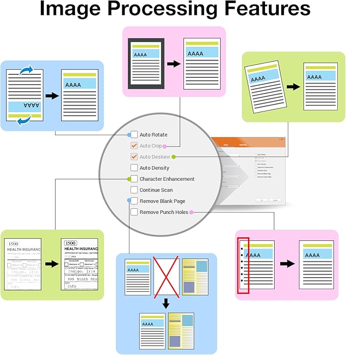 • Intelligent color and image adjustments β€” Auto Rotate, Crop, Deskew and blank page remove with Plustek Image Processing Technology