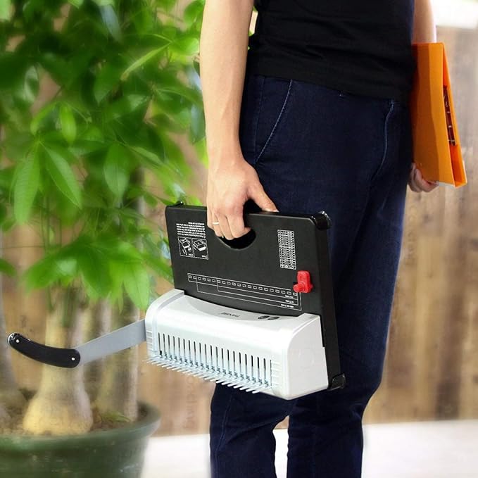 - 【Easy to Use】: Only 2 steps! All-in-one punching and binding in the same machine. The whole process requires little force. Simply line up the pages, press the punch lever and then slip in the comb.Please press the punching handle all the way to the bottom and DO NOT pause halfway while punching, otherwise the papers will get stuck. If the machine gets stuck, stop immediately to avoid further damage, and disassemble the machine to clean up the debris according to the user manual
