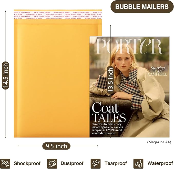 - Kraft Bubble Mailers: The yellow Kraft bubble mailers outer size is 9.5x14.5 inch, while the inner size is 9.5x13.5 inch, with yellow kraft paper, which color is bright and clean. Feel nice to the touch. Extra smooth surface is perfect for handwriting, labeling and stamping. With full air bubbles, our bubble mailers can protect your value products from damage caused by external impacts