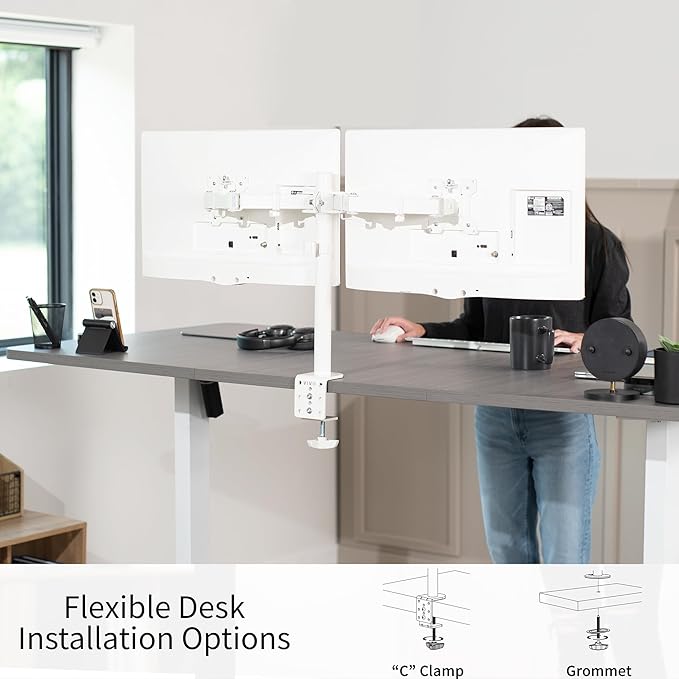 VIVO White Dual 13 to 27 inch LCD LED Monitor Desk Mount Stand with C-clamp and Bolt-Through Grommet, Heavy Duty Fully Adjustable Arms for 2 Screens STAND-V002W