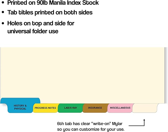 - DIVIDER SET DETAILS: Each set of file dividers is pre collated and has 6 color coded tabs. Each set consists of the following pre printed tab titles: Position 1 - HISTORY & PHYSICAL (Blue Colored Tab), Position 2 - PROGRESS NOTES (Yellow), Position 3 - LAB/X-RAY (Green), Position 4 - INSURANCE (Brown), Position 5 - MISCELLANEOUS (Pink), Position 6 - BLANK WRITE-ON. Contains 65 complete sets of 6 index tabs.