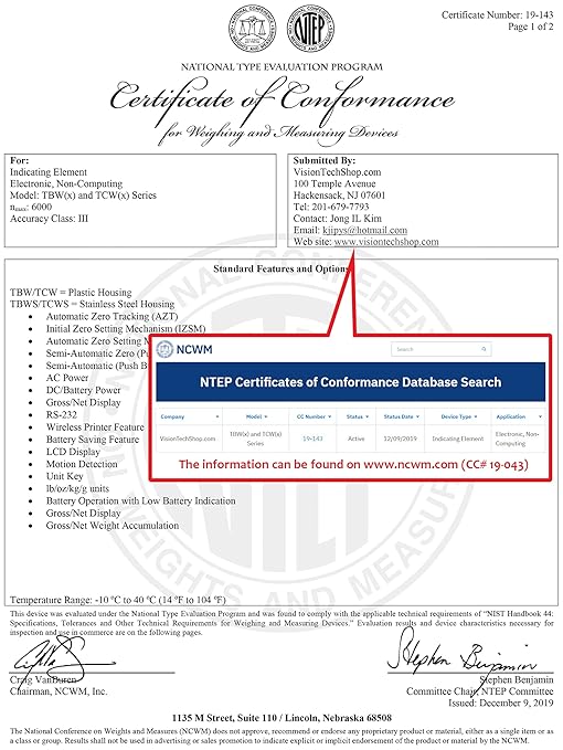 • Lb/Kg/Oz Switchable, Easy Operating, Adapter included, Built-in Rechargeable Battery, NTEP Certificate, Indicator CC# : 19-143, Platform, CC# : 19-144