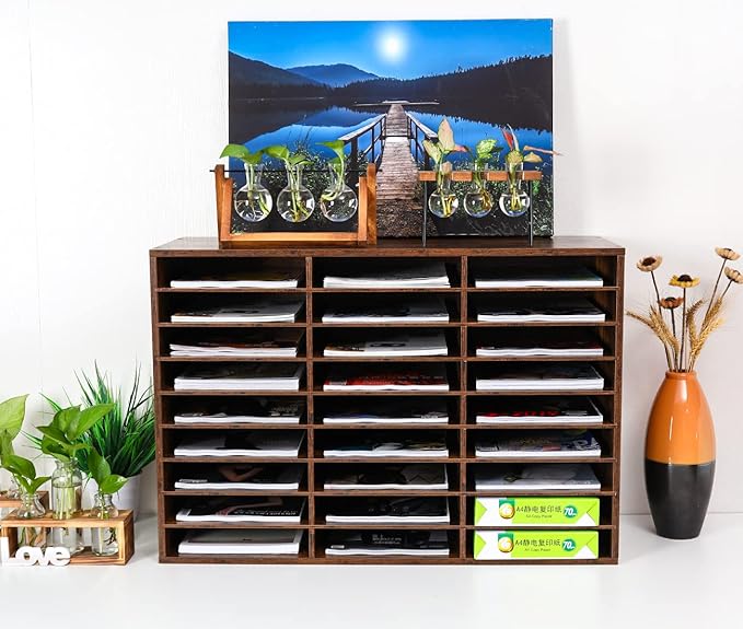 PAG Wood Literature Organizer Mail Sorter Student Mailbox for Classroom Desktop Bill Paper Holder for Office Home School, 27 Compartments, Antique Brown