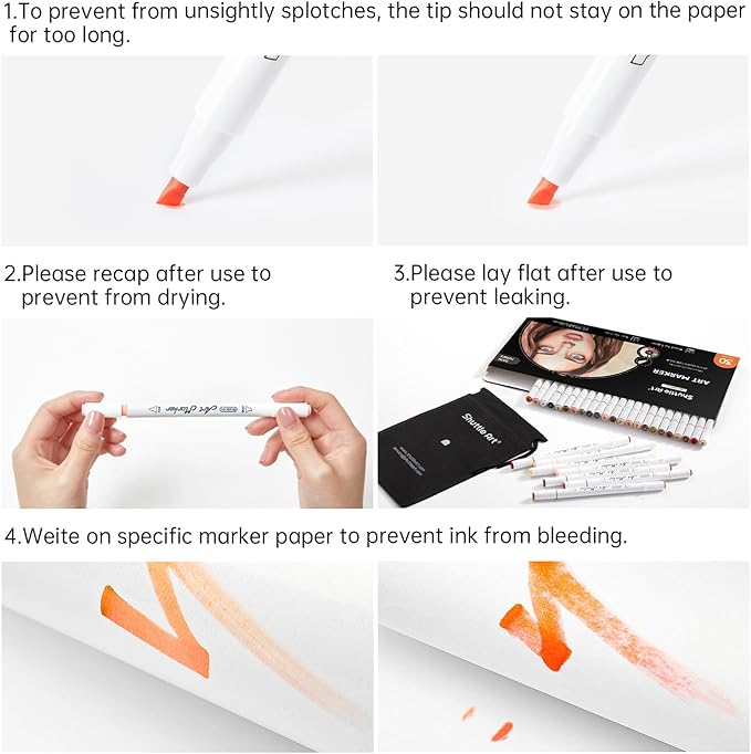 - CAUTIONS:The marker set is non-toxic and acid-free, safe for kids and students, conforming to ASTM-D4236. In order to prevent the ink bleeding in use, the tip should not stay on the paper for a long time. Markers need to write on a specific mark paper so that it doesn't bleed to the next layer. To prevent the marker from drying and ink leaking, please recap and keep the marker laid flat after use.