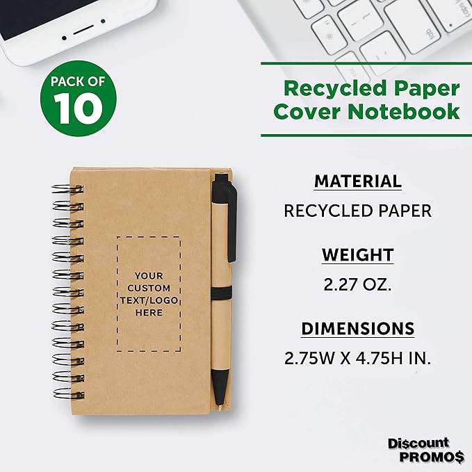 Custom Mini Spiral Notebooks with Black Ink Pens Set of 10, Personalized Bulk Pack - Perfect for School, Office, Business, Home - Black