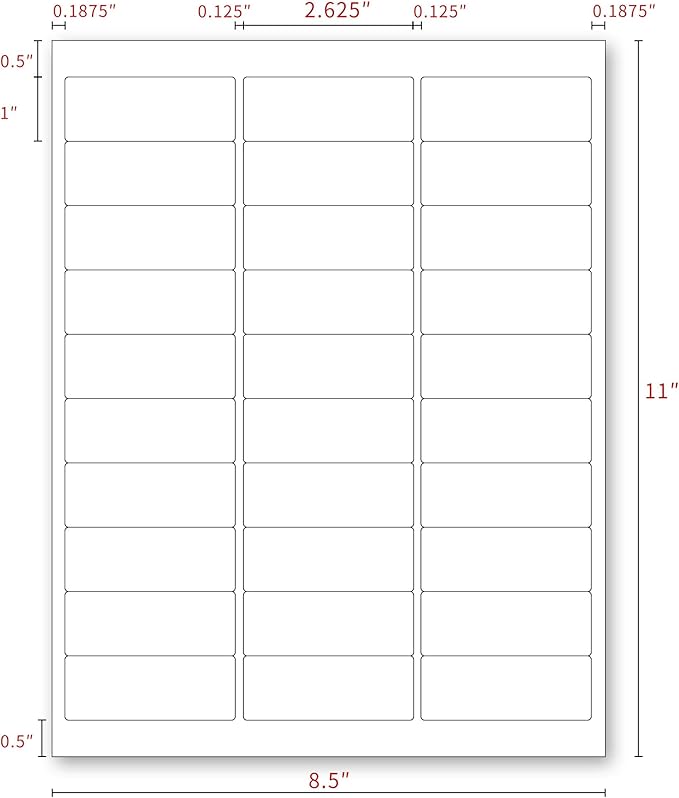 • 15000 PRINTER LABELS come in 500 sheets of 30 labels each. Each label measures 1”H x 2.625”W, perfect for creating your own return address stickers on your laser or inkjet printer.