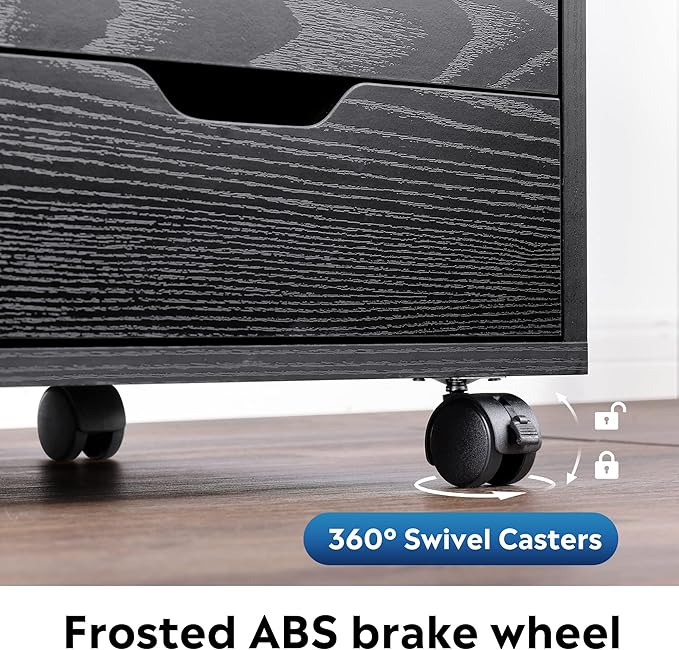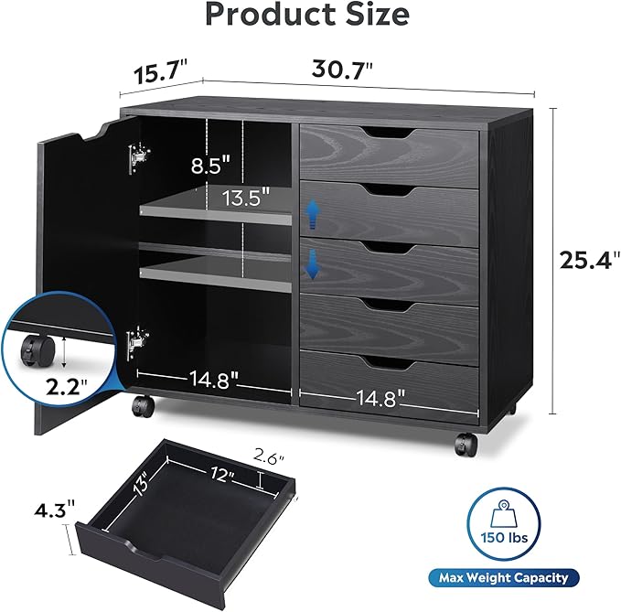 DEVAISE 5-Drawer Wood Dresser Chest with Door, Mobile Storage Cabinet, Printer Stand for Home Office, Black
