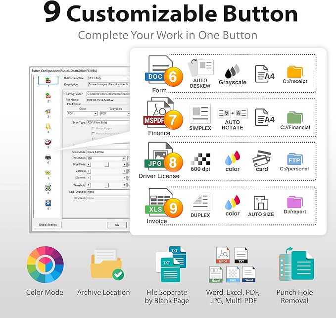 - 【One Touch Workflow】: Customizable scan button configuration, one button to digitize your document with all pre-set profiles, including file format, color format, image adjustment and saving destination. Efficiently sharing document to your colleagues.