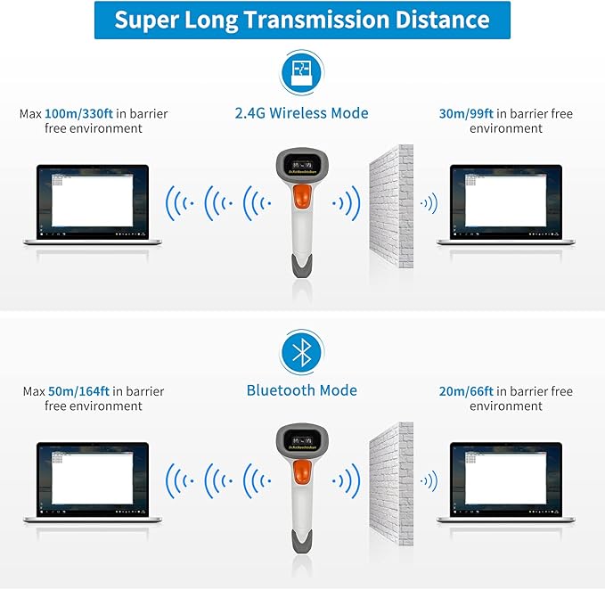 - โฒAuto Scanning & Storage Mode - Manual Scan & Auto-sensing Scan & Continuous Scan. Two working mode: Instant upload mode / storage mode. Scan and store barcodes, then update the data to your device when you come back entering the wireless transmission range. Sometimes the self-sensing scanning function is in the inactive stage, please contact us and be at your service at any time.