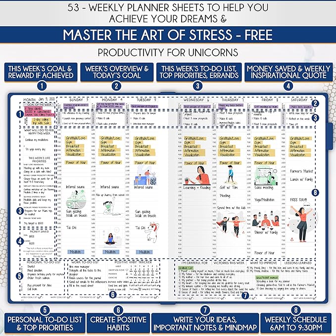 - LIFE PLANNER - A5 Size, 212 pages of life transformation, 53 weekly, 12 monthly planning overviews & reflection, 22 dotted journal pages, habit trackers, mind maps, morning & evening routines, inner pockets, pen holder & gift box