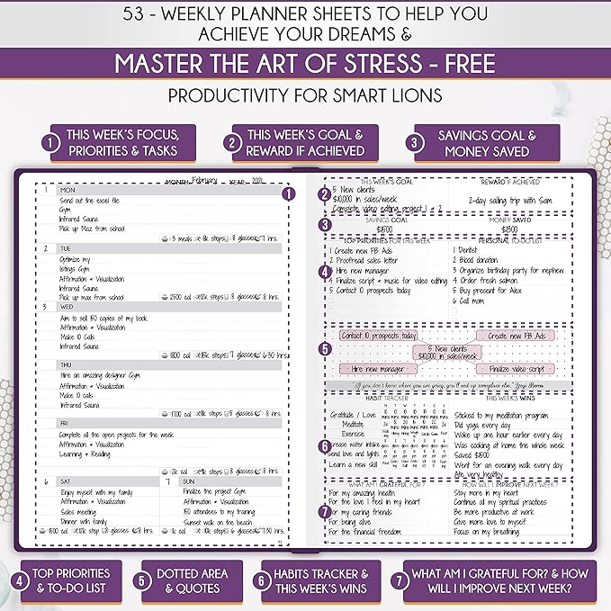 - HABIT TRACKER JOURNAL - Reduce overwhelm, tension, and procrastination by using a groundbreaking 8-step technique to reclaim your life's balance, clarity, and serenity while achieving your goals. Seize the potential of each day. This personal organizer dedicates a separate page for every day, featuring sections for scheduling, goal setting, prioritization, task lists, reflection, and ample space for notes. With its expansive large format, you possess all the room necessary for comprehensive planning.