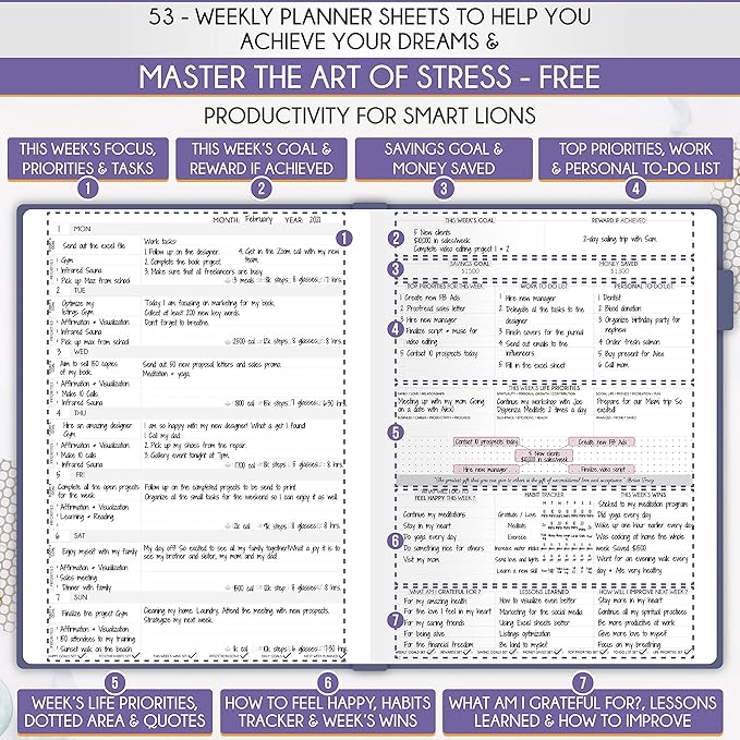 - LIFE PLANNER - A5 Size, 212 pages of life transformation, 53 weekly, 12 monthly planning overviews & reflection, 22 dotted journal pages, habit trackers, mind maps, morning & evening routines, inner pockets, pen holder & gift box
