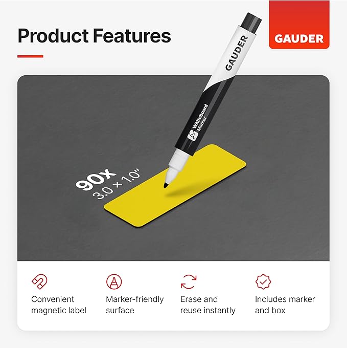 • REUSABLE AND SUSTAINABLE: GAUDER magnetic labels can be written on with the included whiteboard marker and reused repeatedly.