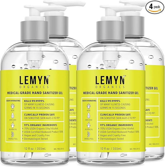 Medical Grade Hand Sanitizer Gel - 97% ORGANIC - 12 FL.OZ. (PACK OF 4)