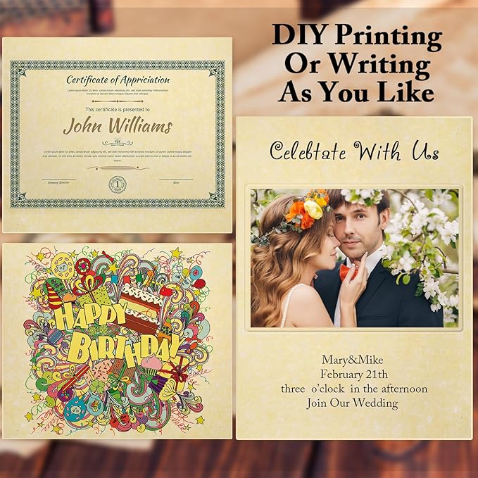 - Work As Different Things: these plain certificate papers are flexible in use, you can use them as certificate printing, wedding invitation, birthday invitation, restaurant menu, theme party decoration and so on, running smoothly in laser and inkjet printers, copiers and offset applications without jams