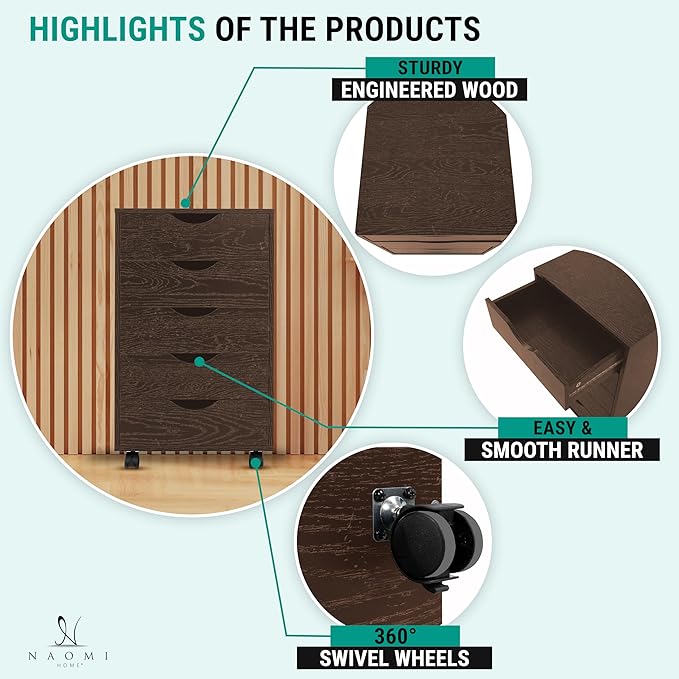 Naomi Home Wooden Office File Cabinets for Home Office, Lateral File Cabinet, Mobile Storage Cabinet Filing Storage Drawer Espresso/5 Drawer