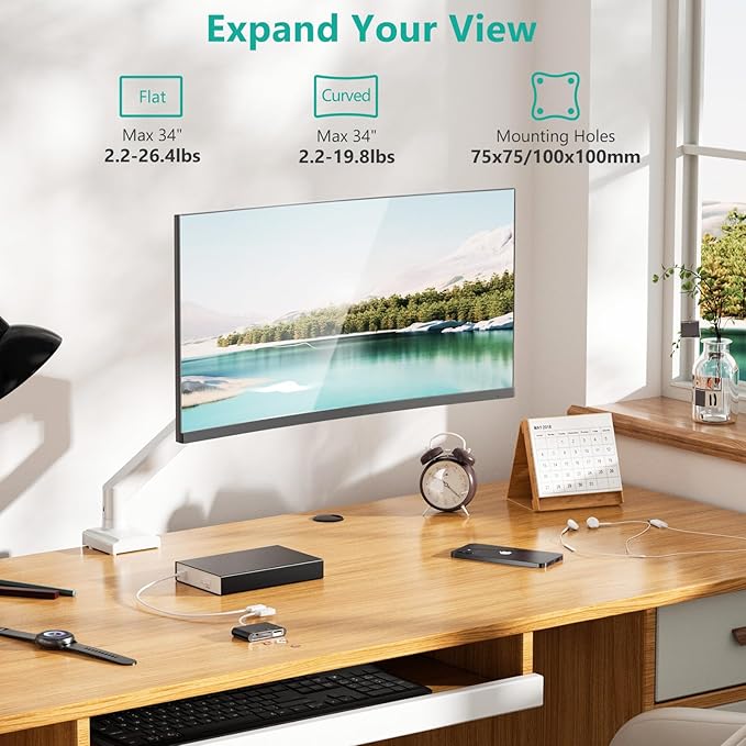 - Compatibility: Single monitor arm fit most flat or curved LCD/LED screen from 17 to 32 in, support up to 19.8lbs with 75x75mm, 100x100mm mounting holes. The two-stage locking system is applicable to 0.4”-3.3” thick desk for both C-clamp and Grommet Base