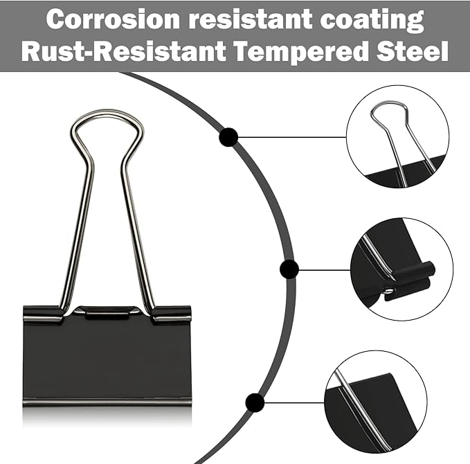 • Jumbo binder clips are made from tempered steel, ensuring long-term durability and maintaining flexibility for unlimited reuse. Assembled with steel arms, the clips provide an extra strong grip for your documents
