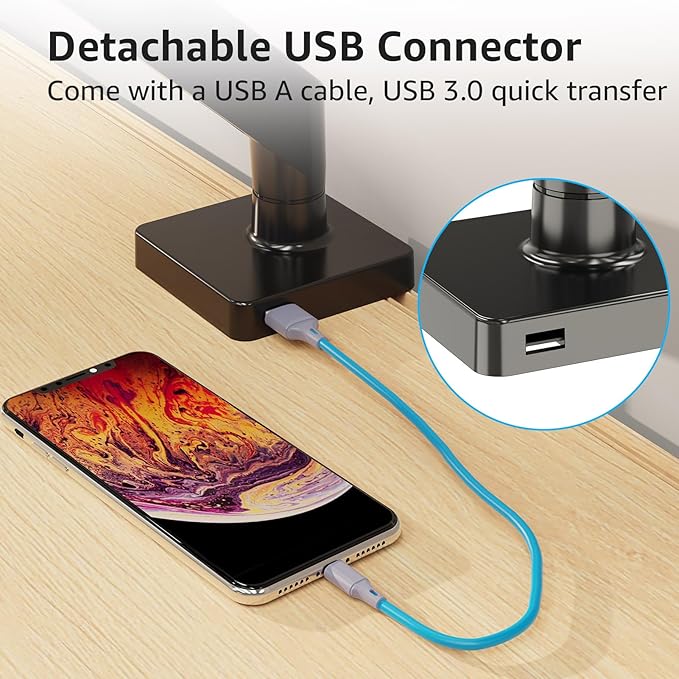 - EASY TO ASSEMBLE & USB connector- The VESA mount is easy to install with a drill-free c-clamp or grommet base mount. The VESA plate connection adopts rotary locking to realize tool-free installation. Comes with a clear manual and the mounting hardware needed. Less than 15 minutes from opening the box to use. Upgraded designed, monitor stand has a USB-A connector in the base (can be detachable), and comes with a USB 3.0 cable, which is great for charging devices.