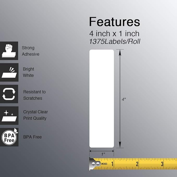 - [ Specifications ]: 4 in x 1 in (102 mm x 25 mm) (1375 Labels/Roll, 20 Rolls) Paper tube diameter 1"(25.4mm). No Ink Toner or Ribbons Needed! Save your money and effort.