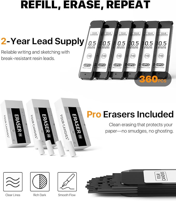 - Mechanical Pencil Set: This set contains 3pcs 0.5mm drafting pencils and 360pcs HB Lead Refills, 3pcs 4B erasers, 9pcs eraser refills and a plastic storage case; This mechanical pencil set is suitable for writing, drawing, and sketching