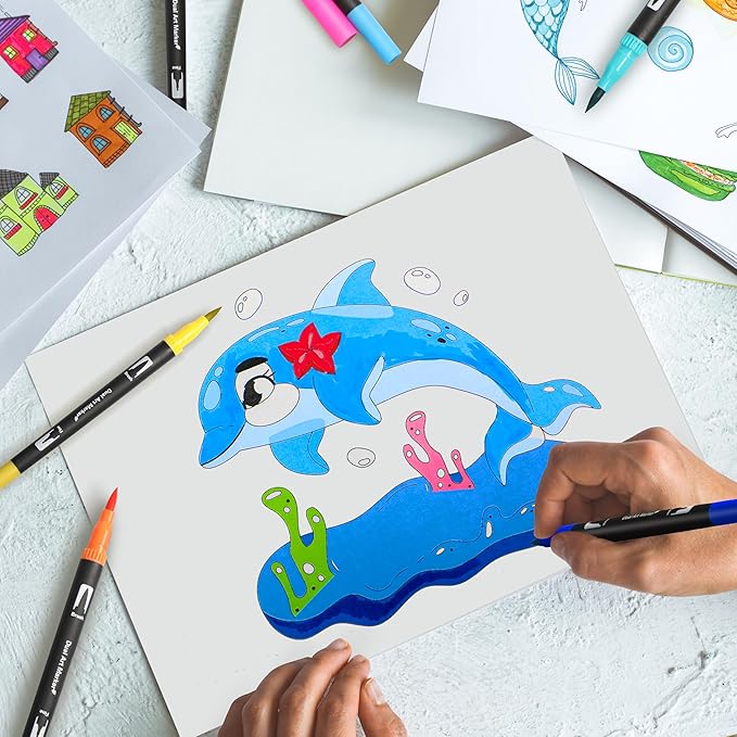 - π¨Dual Brush Marker Pens:The coloring markers have a dual tip design with a 1-2mm brush tip and a 0.4mm fine tip, allowing you to create medium or bold strokes by varying the pressure of the brush, while experiencing fine strokes with the fine tip.The 0.4mm fine tip markers are great for sketching, tracing, and detailing, while the 1-2mm brush tip markers are great for giving large areas of color. The dual-head design fully meets your needs in different situations.