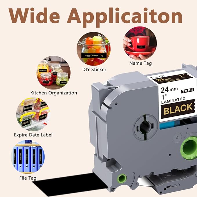 - Product features : Split back, water resistant, fading resistant, abrasion resistant, temperature resistant, strong adhesive. This compatibel label tape 24mm TZe-354 Gold ink on black is suitable for indoor and outdoor use