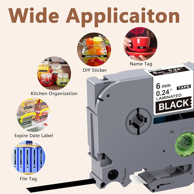 - Product features - The replacement compatible for Brother p-touch label tape 6mm TZe-315 TZe315 is split back, water resistant, fading resistant, abrasion resistant, temperature resistant, strong adhesive. The 6mm white on black tape TZe-315 TZe315 is suitable for indoor and outdoor use