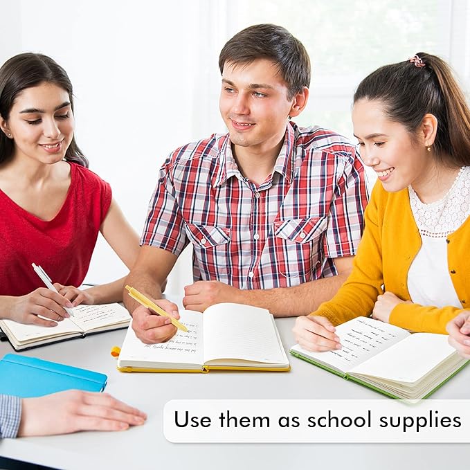 - 5 different solid colors for these notebooks. There are 5 Black Retractable Pens in the box. You can use it as soon as you receive it. These pens are perfect to be put in the pen holder of the classic ruled notebook. Large tube has the capacity of restoring more ink, which makes them long lasting. Quick drying can avoid smearing and smudge.