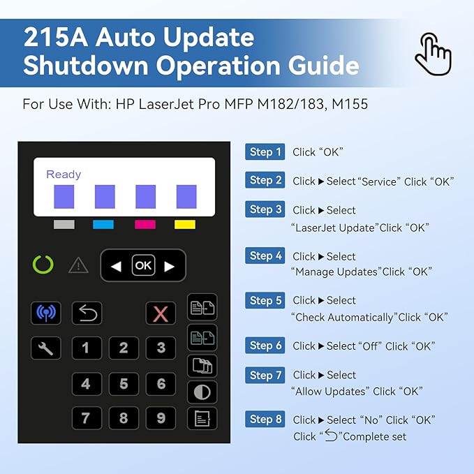 - Notice: To prevent the printer firmware upgrade in the future, please turn off the auto-updates function after installing 215A toner cartridges 4 pack, so as not to affect your normal use