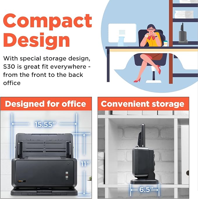 - [Fit in your workspace] - The S30 is only about 4 inches wider than standard scanners, but it can handle Tabloid size and even 12" wide documents. Plus, you can store it upright when you're not using it to save space.