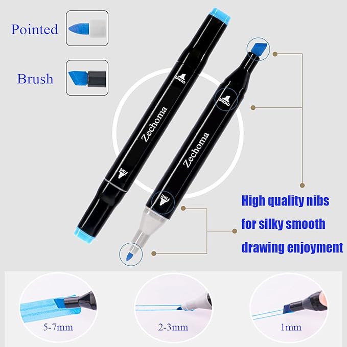- DOUBLE TIP DESIGN: Saves money and space, allowing you to create fine details with bullet tips (0.5 mm-2 mm) or wide sweep strokes (2 mm-7 mm) with the tip of a chisel, immerse yourself in the art. Help even beginners create professional results with these blendable markers