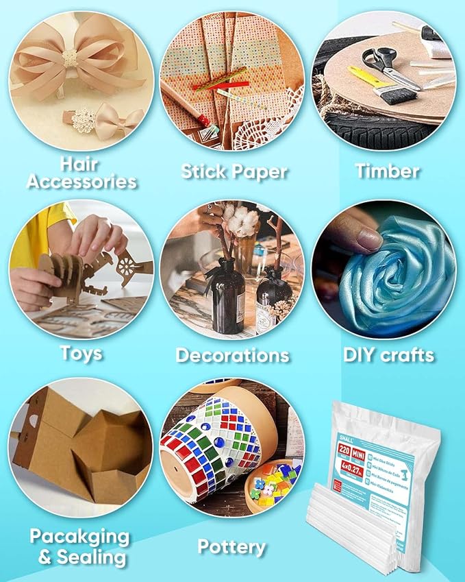 - 220 Glue Sticks Included : Comes with 220 pcs child-safety mini size glue sticks - 0.27" diameter x 4" length, which is compatible with most glue guns on the market