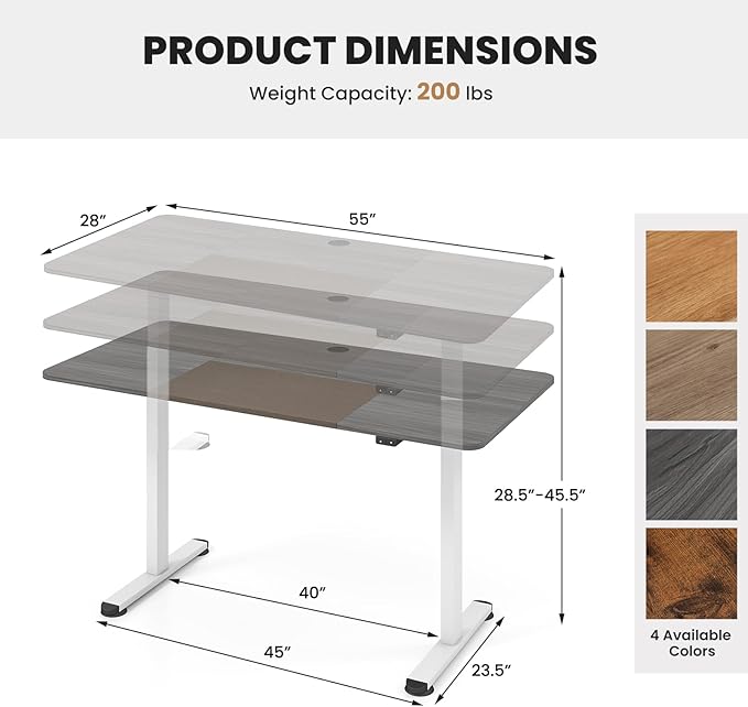 - Make Standing Work Possible: Tired of sitting for long hours? Take a look at this height-adjustable desk. The height of this sit-stand desk can be adjusted between 28.5"-45.5". Just press the control button next to the desk and you can adjust the height of the desk at any time for sitting or standing work.