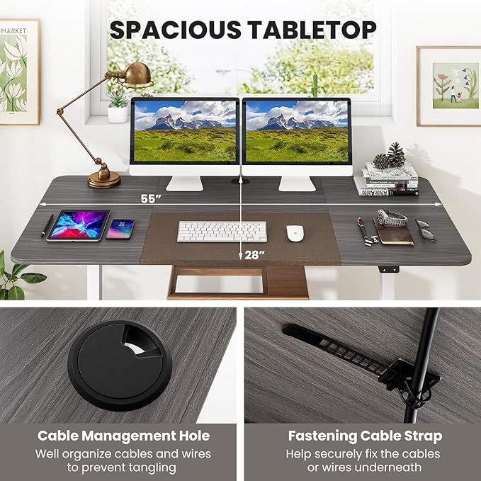 - Spacious Desktop & Complete Accessories: Our stand-up desk comes with a spacious 55" x 28" desktop that provides ample space for 2 monitors or laptops. In addition, the standing computer desk comes with a cable hole and a cable bracket to keep your office area neat and tidy.