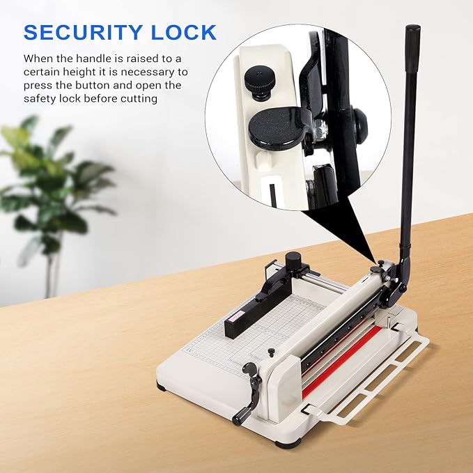 - ★【Security Lock & Cradle】:The security lock on the paper cutter for cardstock can reduce operators' harm by accidents. The multifunctional bracket can support the right part of papers, which makes the paper cutting more convenient.