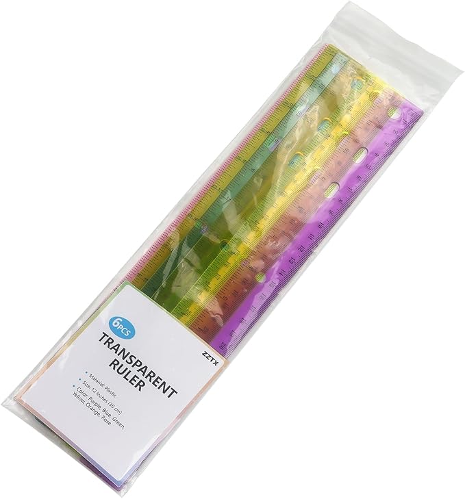 ZZTX 6 Pack Color Transparent Ruler Plastic Rulers 12 Inch, Metric Bulk Rulers with Inches and Centimeters, Kids Ruler for School, Home, Office