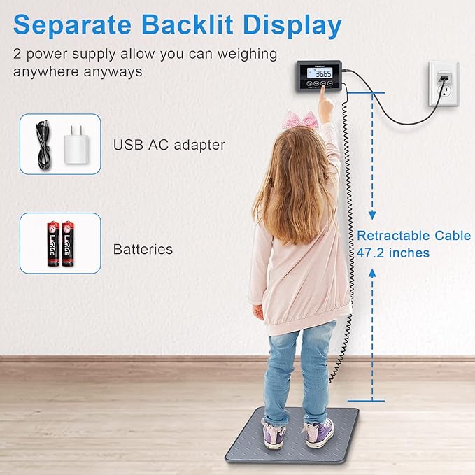 - BRIGHT LCD DISPLAY & 2 POWER: THINKSCALE postage scale will not turn off automatically by default, Back-lit LCD display is easy to read and can be moved with the connected cable for clear visibility when weighing large items, and it has two rear pin slots for wall mounting or other heights. It support powered by batteries or USB DC adapter both included.