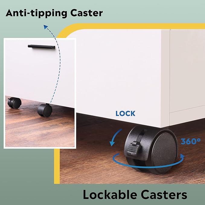 - 【Easy to Move】 Equipped with five 360° swivel wheels, including 2 front lockable wheels and 1 anti-tip wheel for stability. Move your filing cabinets anywhere you like without worrying about it tipping over.