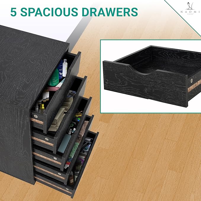 Naomi Home 5 Drawer Office Storage File Cabinet Under Desk Cabinets for Organization Filing with Wheels, Printer Stand Storage, 180 lbs Capacity, Distressed Black (11397AM)