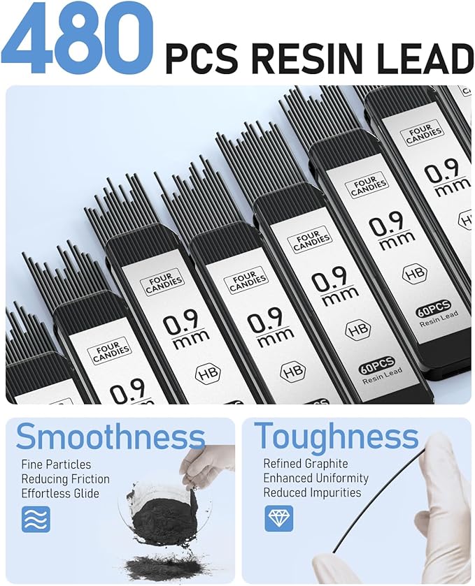 - 0.9mm Strong Leads: 8 tubes of 60pcs super capacity leads; A more durable resin lead which doesnβt require sharpening and is not easy to break, provides ultra-smooth writing and clear dark lines