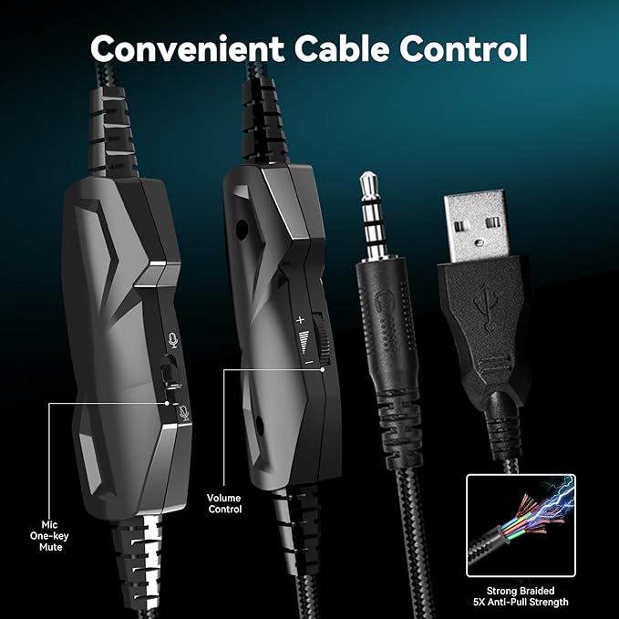 - 【Professional Gaming Headset】Gaming headphones with 6.5ft high tensile strength, anti-tangle braided cable, rotary volume control and button microphone mute.