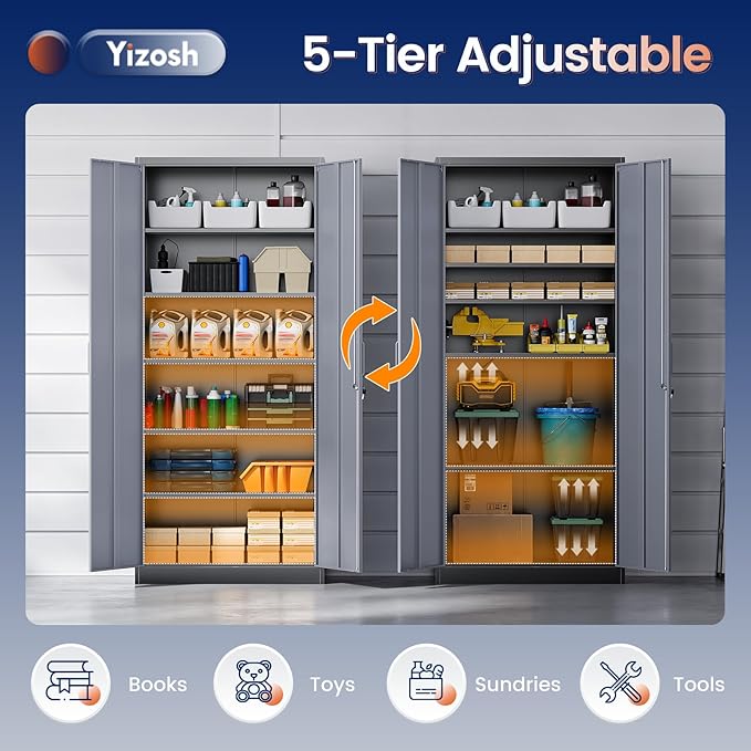 - 『PRACTICAL DESIGN』:Our tall metal cabinet equipped with lock and 5 adjustable shelves to provide adaptability and convenience. High-grade lock picking to secure valuables, two keys are included. Regardless of what your storage needs are, you have the ability to create a unique storage space to suit them.