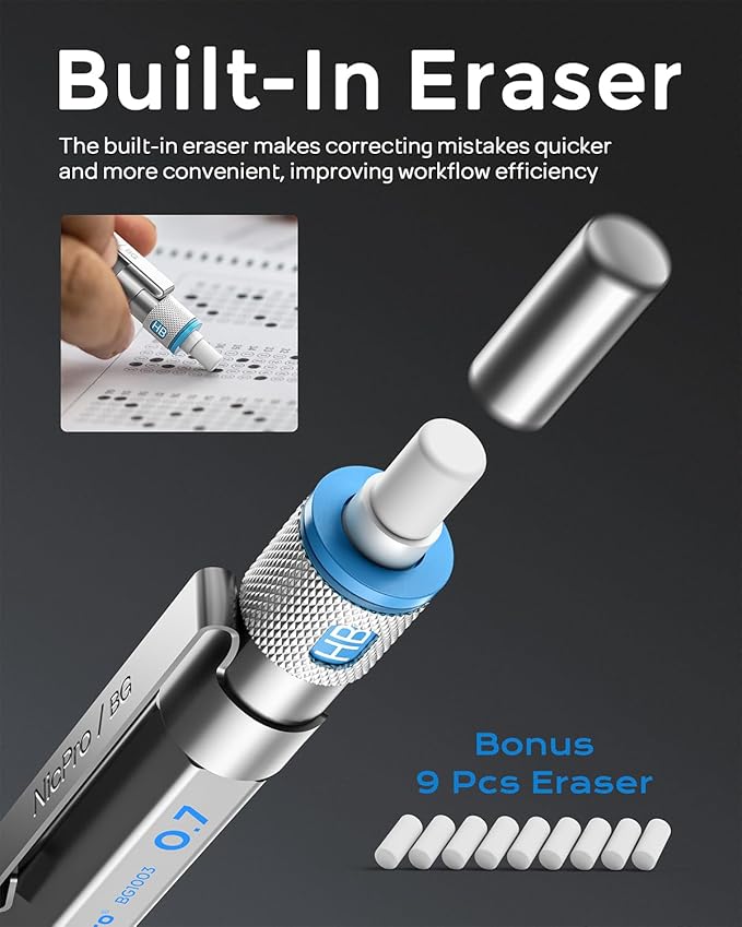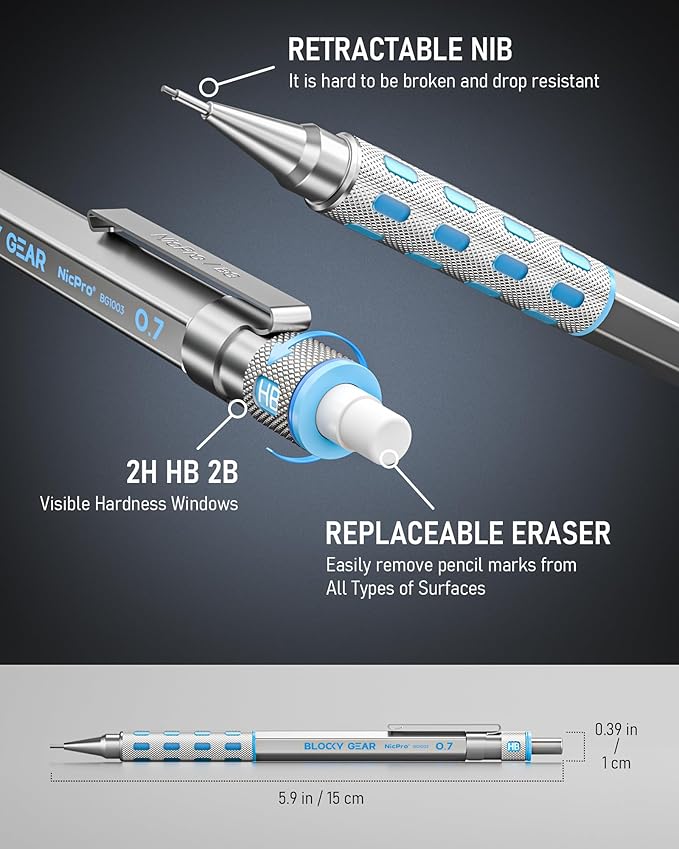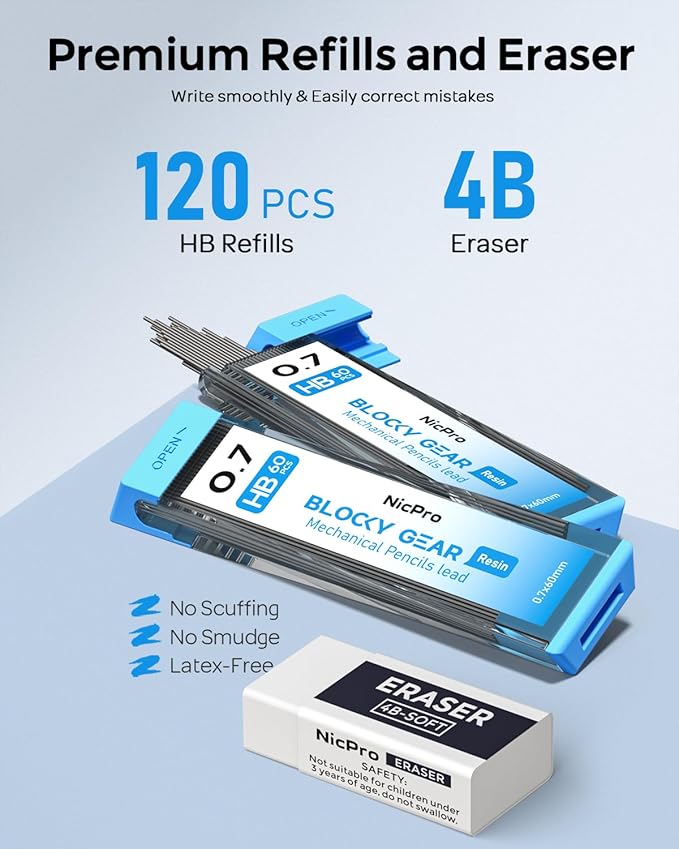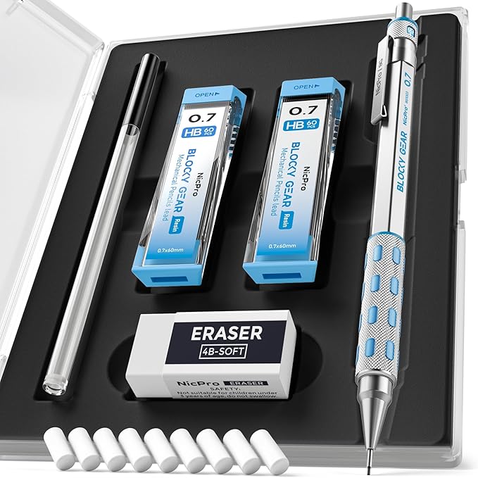 - Nicpro Blocky Gear:Come with a metal 0.7mm mechanical pencil and 2 tube of 0.7 mm HB lead refills,60pcs / tube,1pcs 4B latex-free eraser,9pcs replaceable cap erasers,all the stuff storage neatly in a case with flocking tray,what a gift for friends & family!