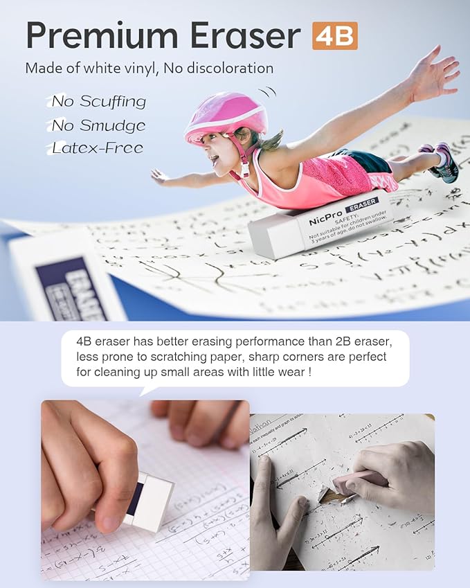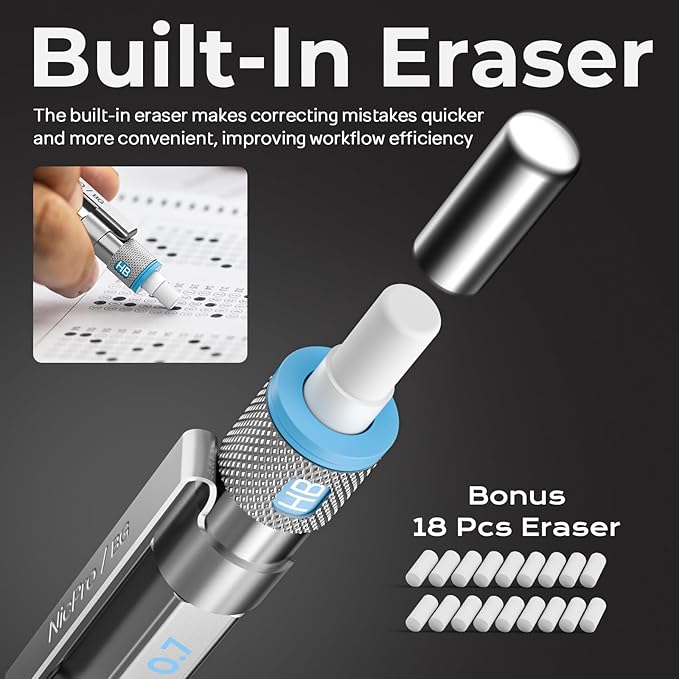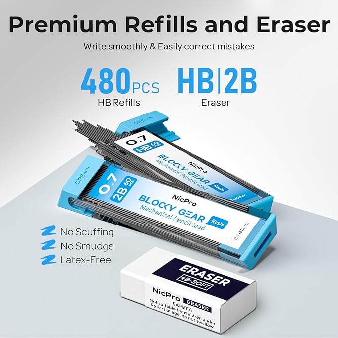 - All-in-One Mechanical Pencil Set:The Nicpro blocky gear set comes with 3PCS metal 0.7mm mechanical pencil and 8 tube of 0.7 mm lead refills (6 tube of HB and 2 tube of 2B), 60pcs / tube, 3pcs 4B latex-free eraser, 18pcs replaceable cap erasers,1 pcs kneaded eraser, all the stuff storage neatly in a case with flocking tray — making it a perfect gift and must-have for students, teachers, artists, and stationery enthusiasts.