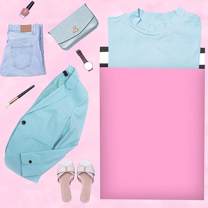 - Eye-Catch Poly Mailers Bags--- Usable size: 19x24 Inch, 100Pack. These shipping bags have a pink outer surface, and gray inner lining, a highly attractive color that makes your products look better. Their smooth texture makes it easy to affix self-adhesive stamps and address labels, helping you customize your brand.